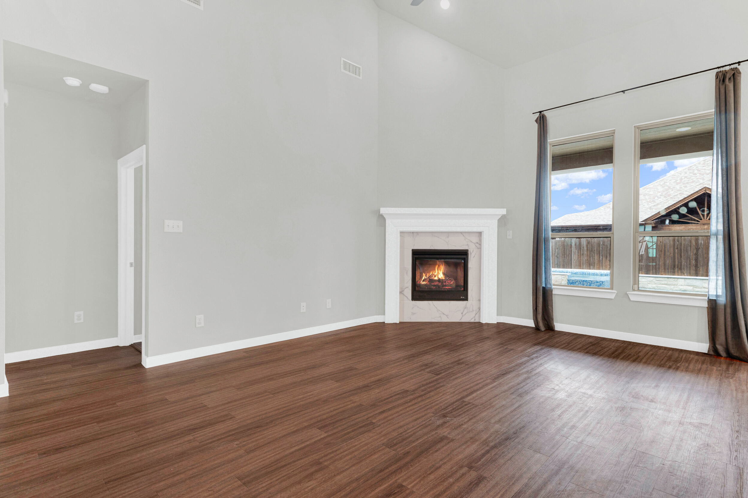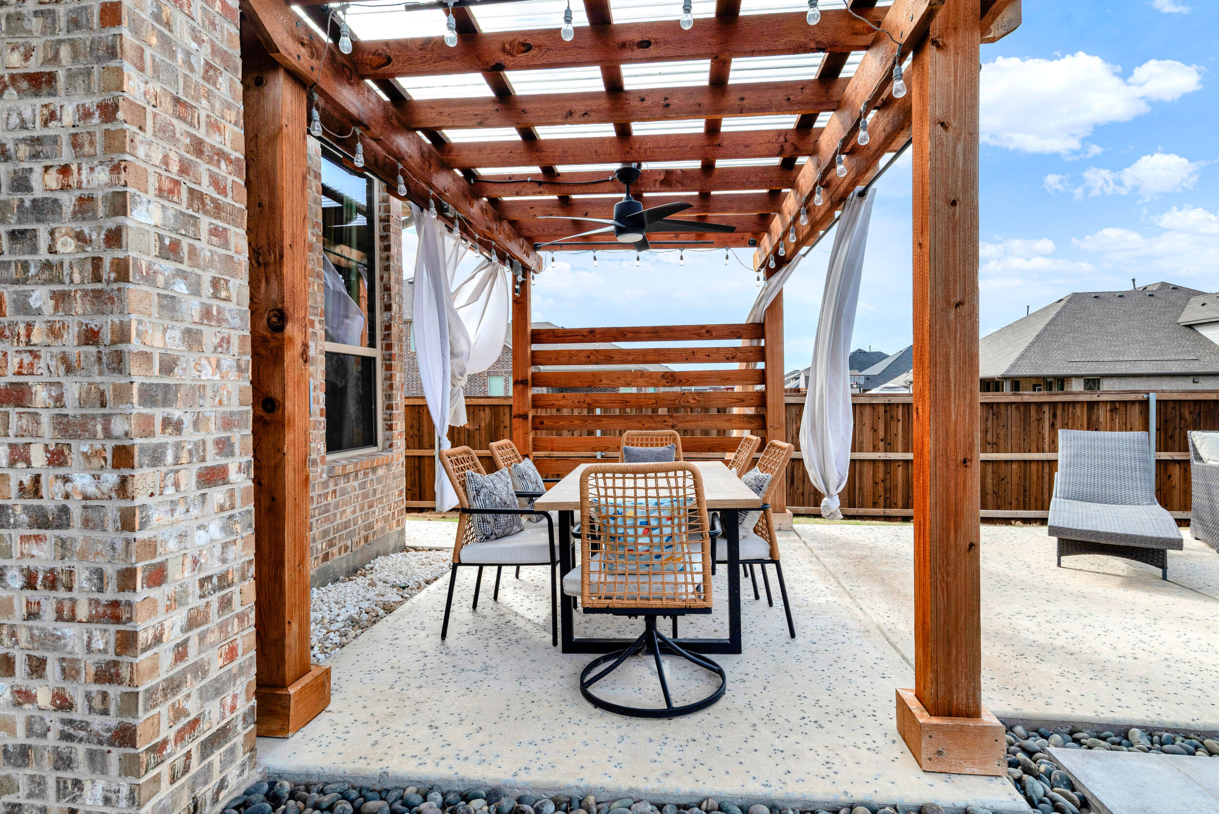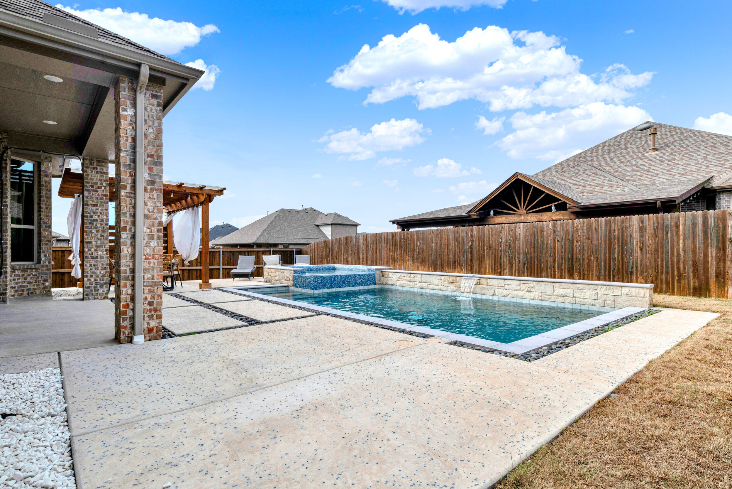Set on a prominent corner lot in the friendly Gateway Parks community, this stunning two-story Highland Homes residence offers exceptional curb appeal with a welcoming covered front porch and a layout designed for both family living and entertaining. Tall ceilings and expansive windows fill the home with natural light, creating an open, airy atmosphere throughout. The open floor plan features inviting living and dining spaces anchored by a corner gas-log fireplace. The well-appointed kitchen showcases quartz countertops, 42-inch custom cabinetry, a gas cooktop, built-in oven and microwave, a corner pantry, and seamless flow into the adjacent breakfast nook. Two bedrooms are conveniently located on the main level, including a spacious primary suite that serves as a private retreat with a bay window, walk-in closet, and an ensuite bath featuring an oversized shower and a freestanding tub. Upstairs, a large media room with a projector provides the perfect space for movie nights and entertaining, while additional living areas offer flexibility for everyday life. The garage includes built-in shelving for added storage. Step outside to a covered patio that opens to a pool and swim spa with upgraded equipment, including salt and chlorine activation, along with a pergola that enhances the outdoor living experience. The backyard is ideal for relaxing or hosting gatherings. Gateway Parks offers an outstanding location with quick access to Highway 80 and I-20, making commuting simple while keeping shopping and dining close by. Community amenities include a clubhouse with pool, splash pad, gym, playgrounds, expansive green spaces, bike paths, and walking trails. The golf-cart-friendly neighborhood also offers bulk trash pickup as part of its maintenance services. With new retail, dining, a Home Depot, and HEB coming soon, this home delivers comfort, convenience, and a vibrant community lifestyle in the heart of Forney.