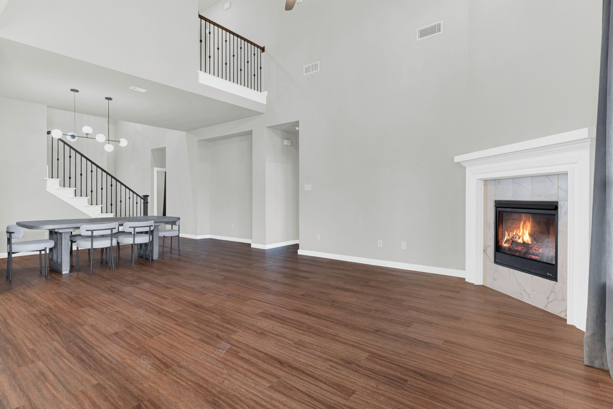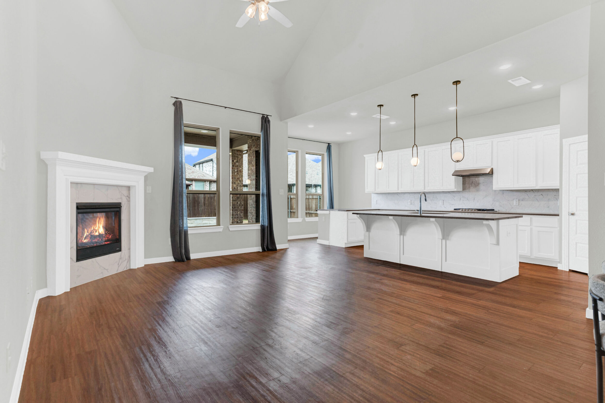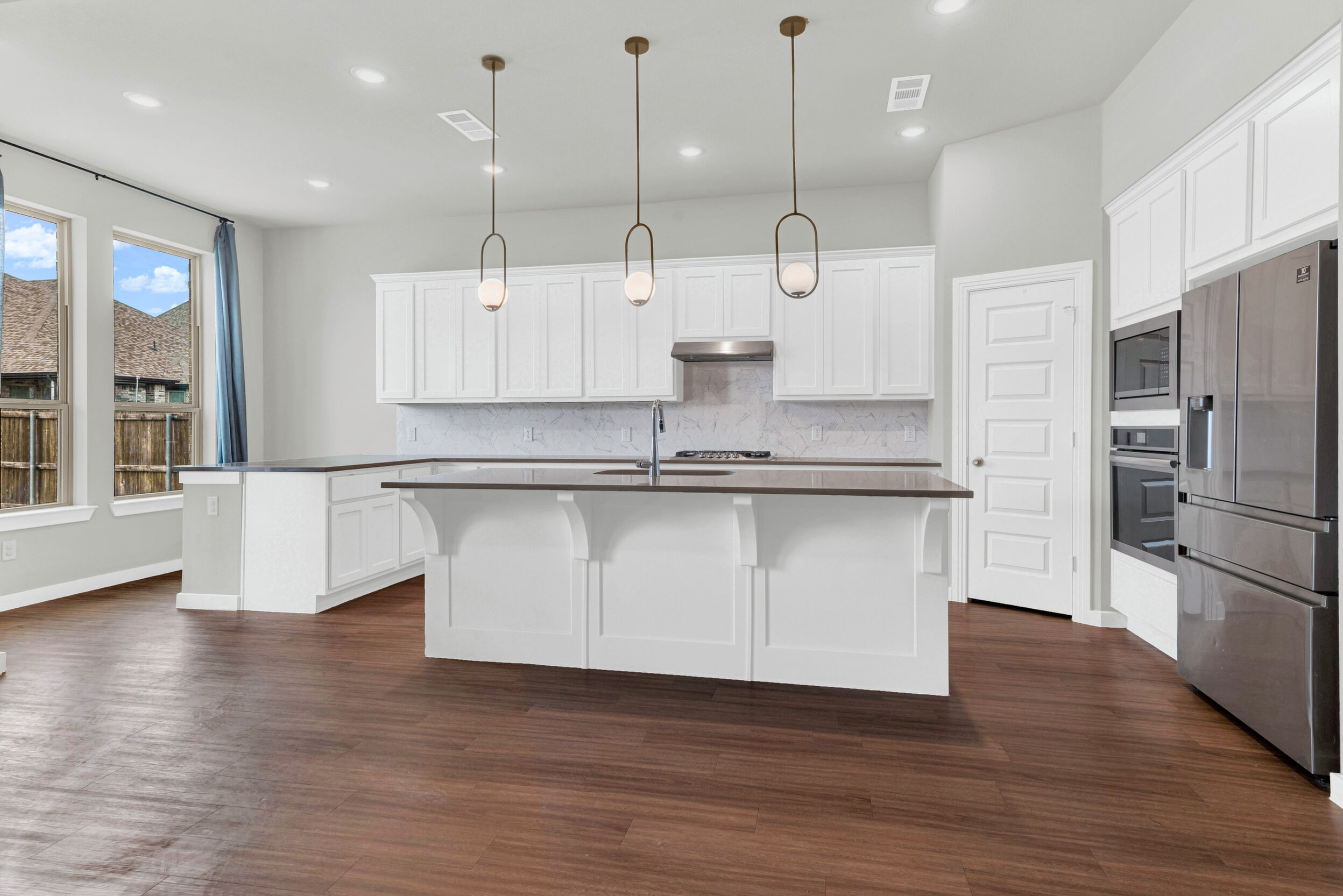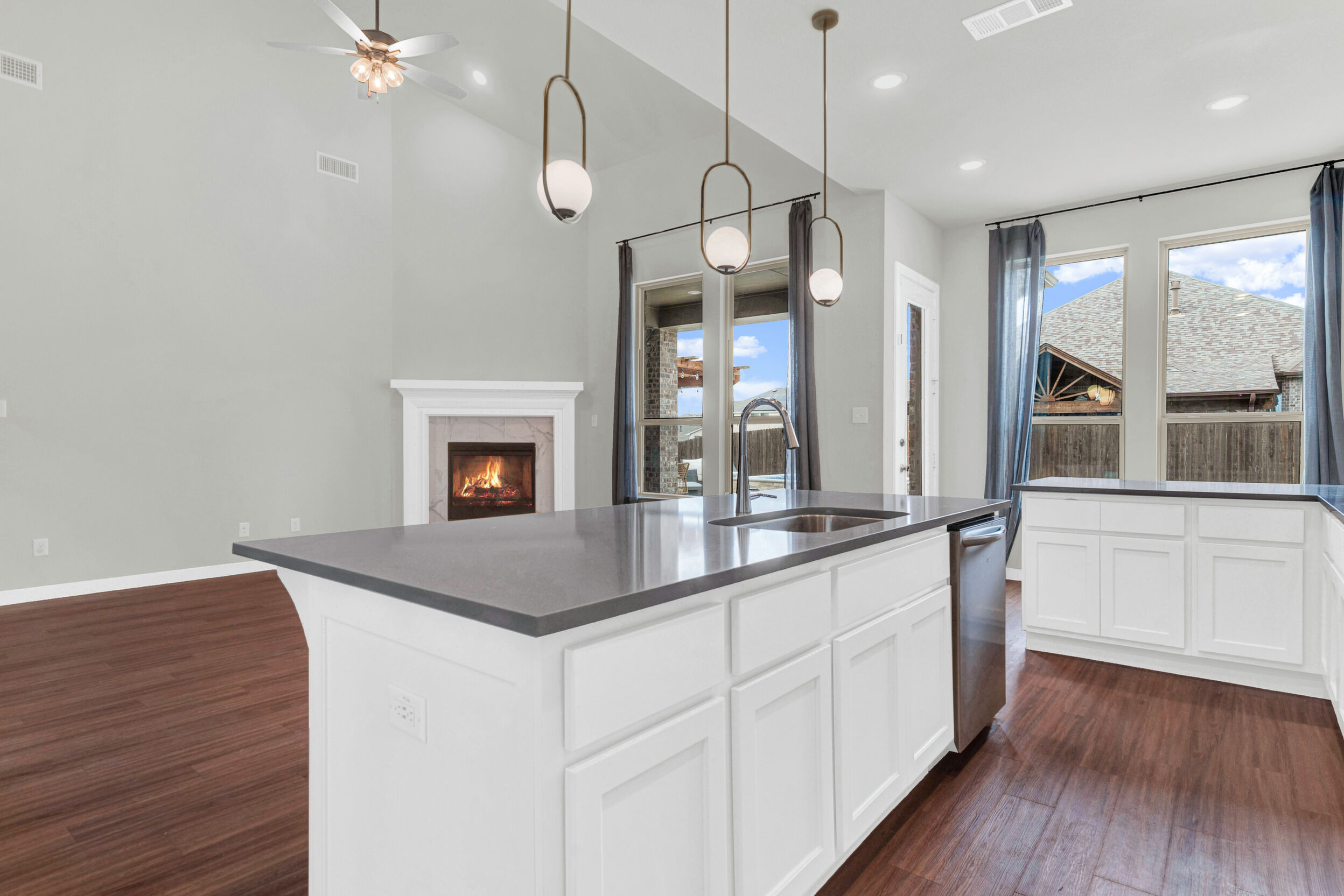 Set on a prominent corner lot in the friendly Gateway Parks community, this stunning two-story Highland Homes residence offers exceptional curb appeal with a welcoming covered front porch and a layout designed for both family living and entertaining. Tall ceilings and expansive windows fill the home with natural light, creating an open, airy atmosphere throughout. The open floor plan features inviting living and dining spaces anchored by a corner gas-log fireplace. The well-appointed kitchen showcases quartz countertops, 42-inch custom cabinetry, a gas cooktop, built-in oven and microwave, a corner pantry, and seamless flow into the adjacent breakfast nook. Two bedrooms are conveniently located on the main level, including a spacious primary suite that serves as a private retreat with a bay window, walk-in closet, and an ensuite bath featuring an oversized shower and a freestanding tub. Upstairs, a large media room with a projector provides the perfect space for movie nights and entertaining, while additional living areas offer flexibility for everyday life. The garage includes built-in shelving for added storage. Step outside to a covered patio that opens to a pool and swim spa with upgraded equipment, including salt and chlorine activation, along with a pergola that enhances the outdoor living experience. The backyard is ideal for relaxing or hosting gatherings. Gateway Parks offers an outstanding location with quick access to Highway 80 and I-20, making commuting simple while keeping shopping and dining close by. Community amenities include a clubhouse with pool, splash pad, gym, playgrounds, expansive green spaces, bike paths, and walking trails. The golf-cart-friendly neighborhood also offers bulk trash pickup as part of its maintenance services. With new retail, dining, a Home Depot, and HEB coming soon, this home delivers comfort, convenience, and a vibrant community lifestyle in the heart of Forney.