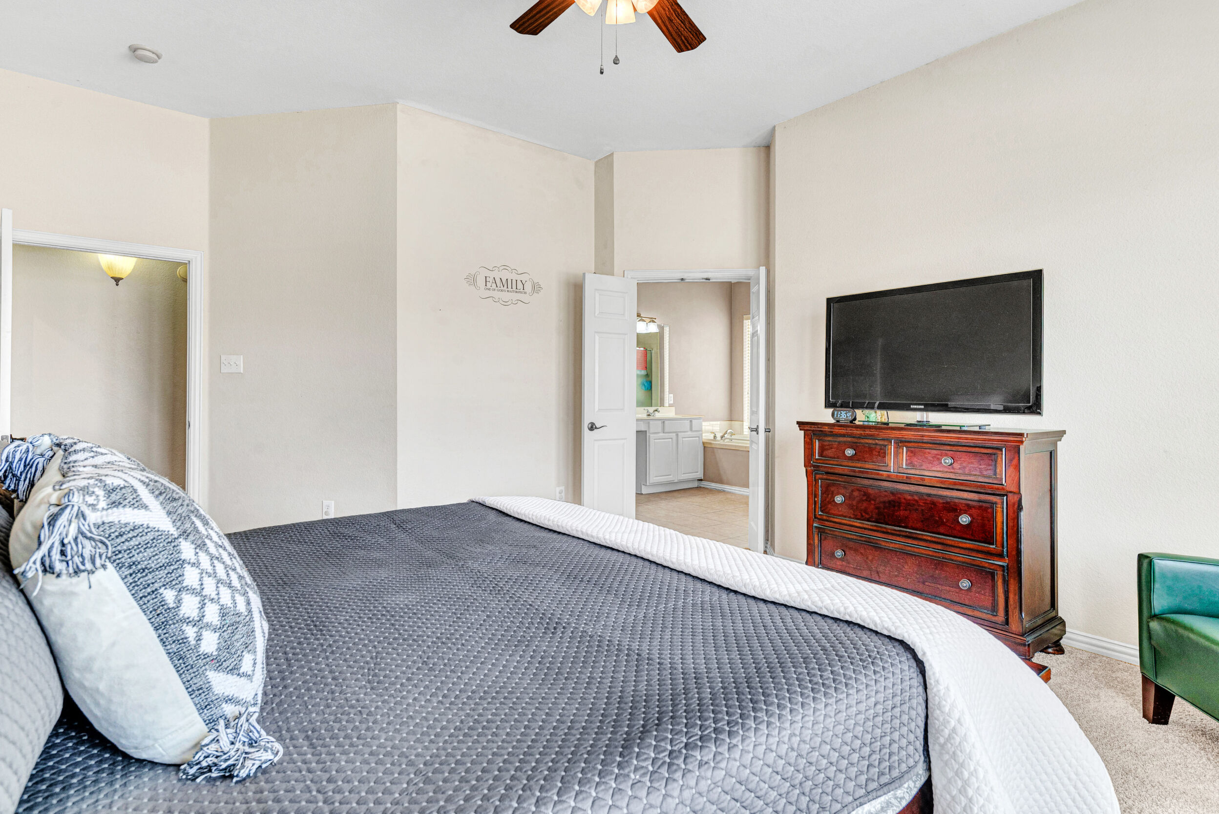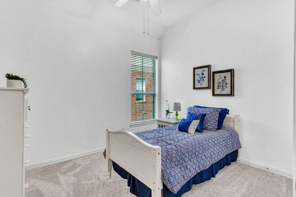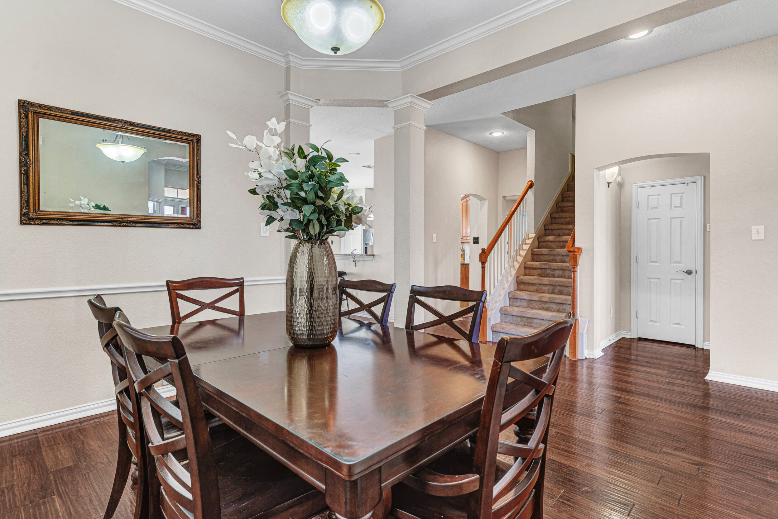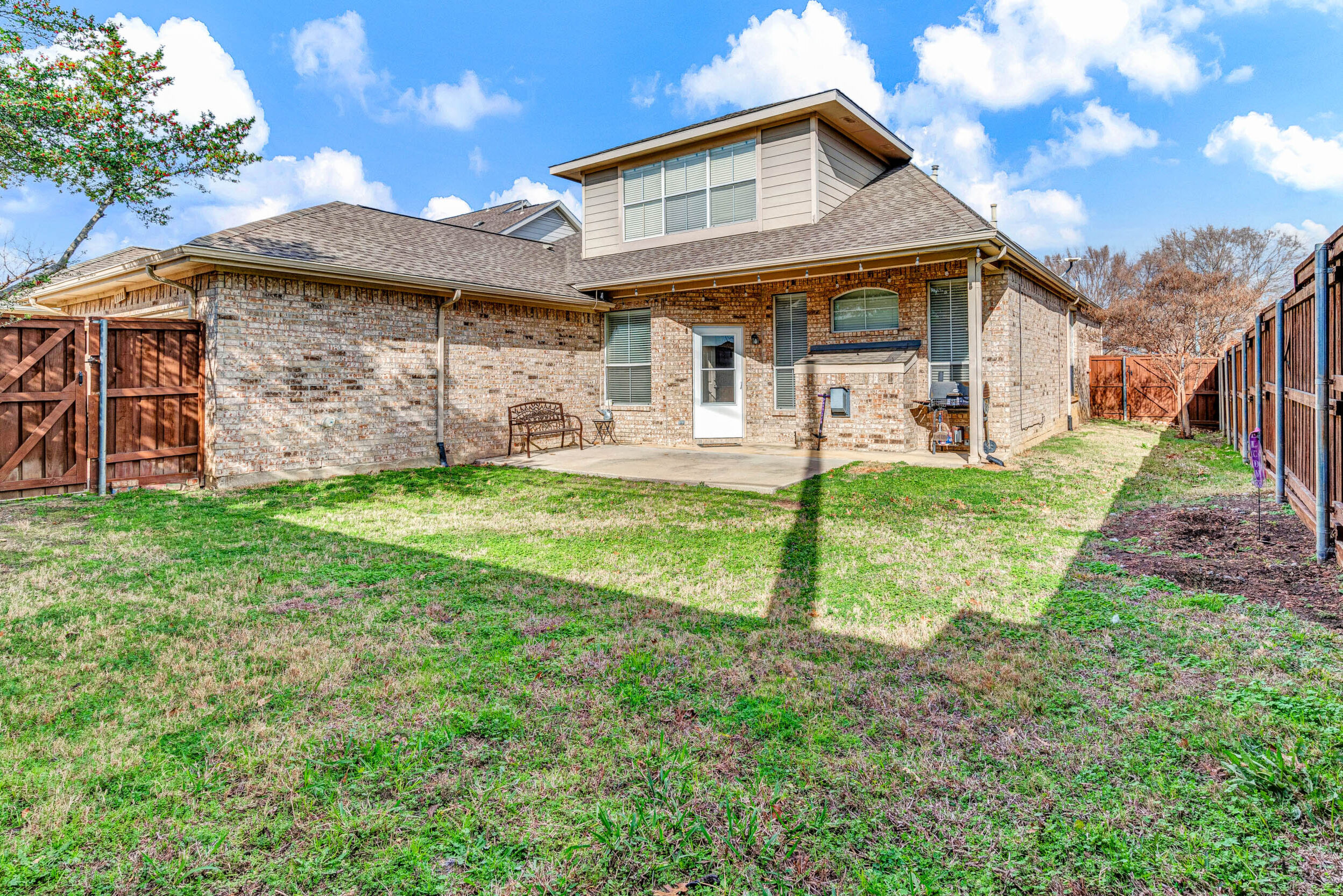 Beautifully appointed four-bedroom, three-and-a-half-bath home in the highly sought-after Homestead at Carrollton community. The thoughtfully designed floor plan offers the primary suite and two secondary bedrooms on the main level, with a generously sized upstairs bedroom featuring an ensuite bathideal as a private guest suite, game room, or media room. The primary suite is a true retreat, complete with a separate shower and jetted soaking tub. Entertain with ease in the formal dining room highlighted by crown molding and chair rail, or work from home in the dedicated study with French doors. The island kitchen opens seamlessly to the spacious family room with a gas-log fireplace, creating a warm and inviting gathering space. The kitchen features granite countertops, abundant cabinetry, a large breakfast bar, and a cozy breakfast nook. Step outside to an oversized patio overlooking a pool-sized backyard, privately enclosed by a multi-level board-on-board fenceperfect for relaxing or entertaining. A small greenbelt directly across from the front porch adds charm and a sense of openness. Located in Lewisville ISD, this home offers comfort, flexibility, and an exceptional setting in one of Carrolltons most desirable neighborhoods.