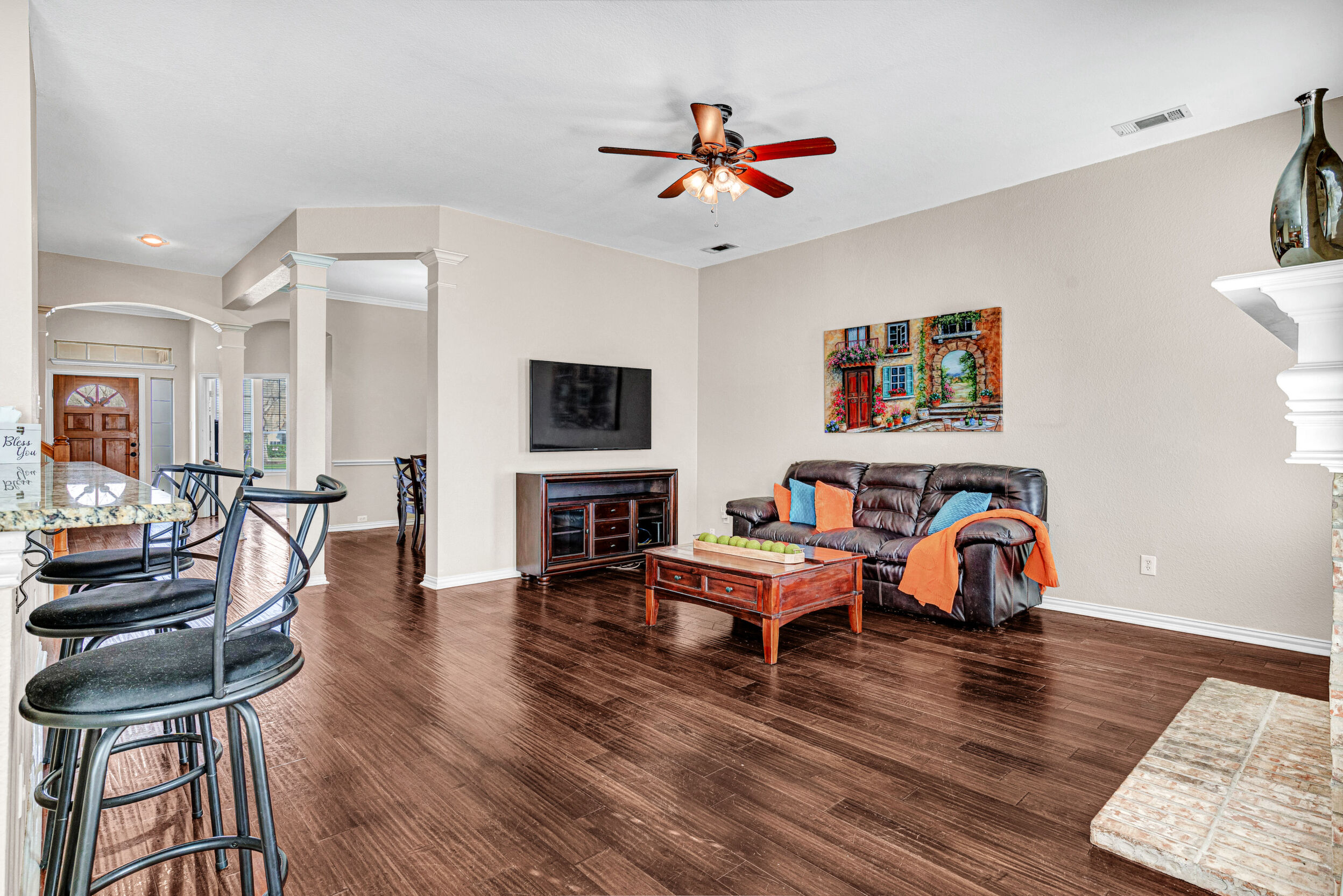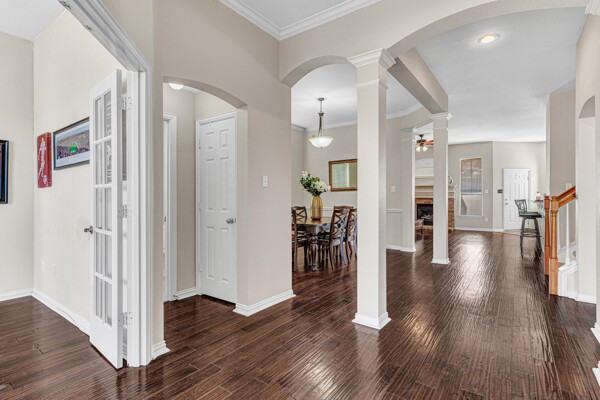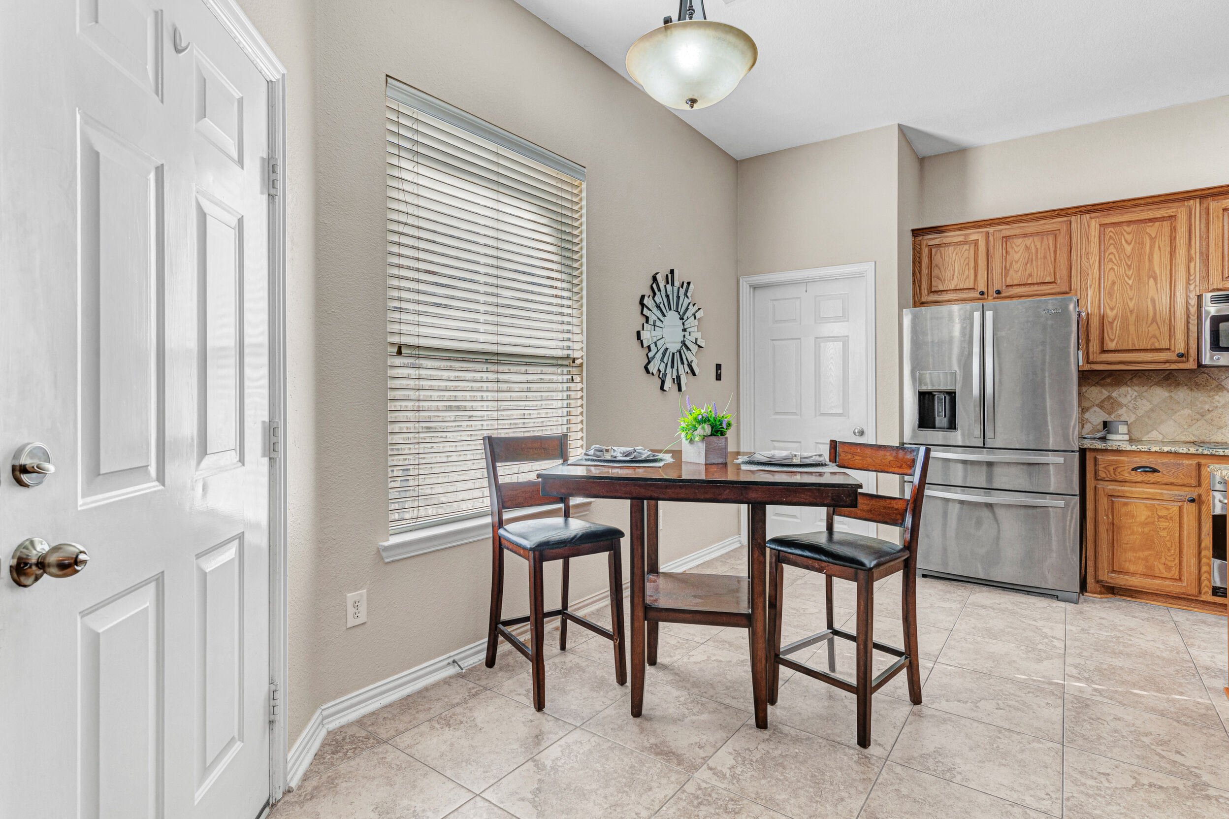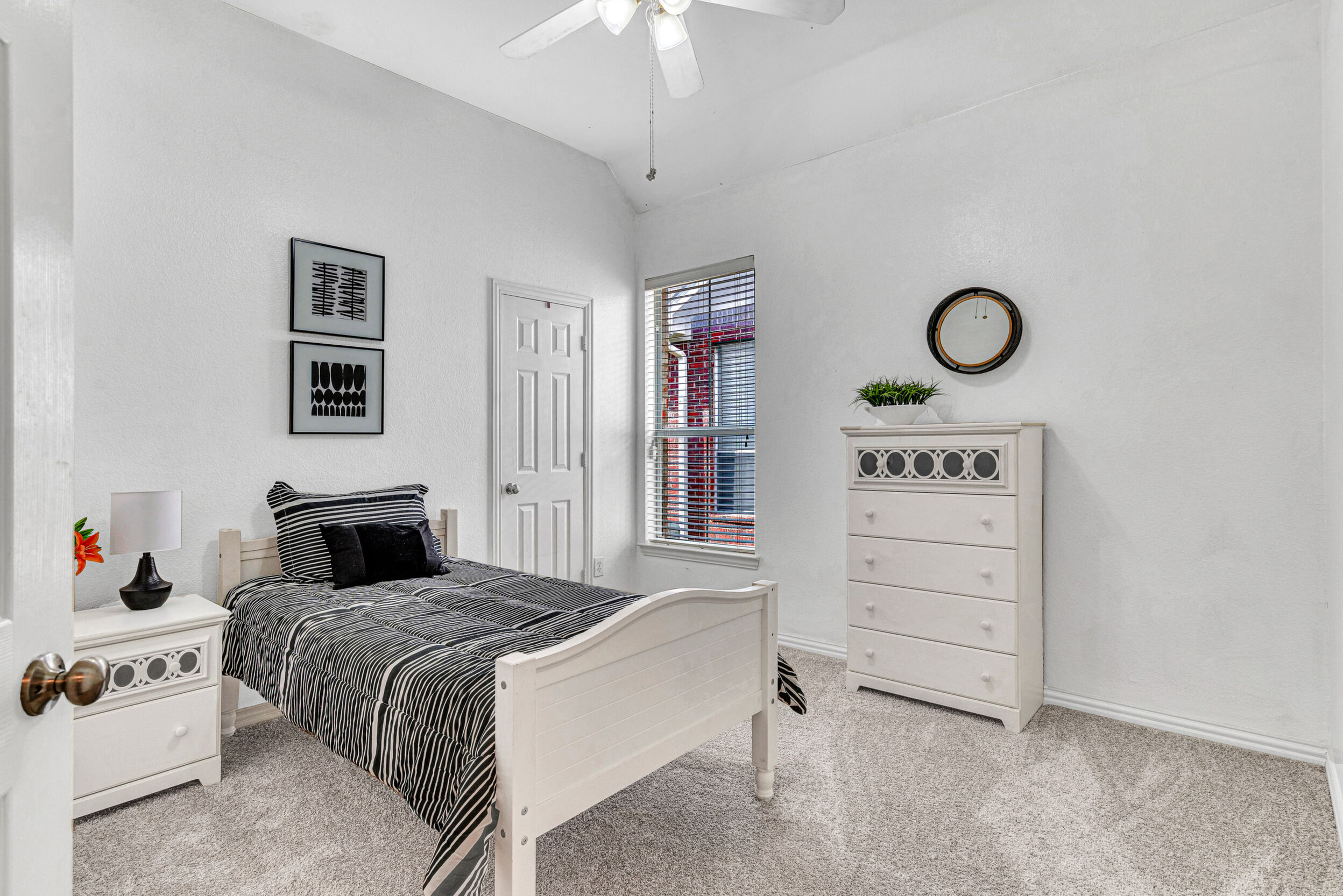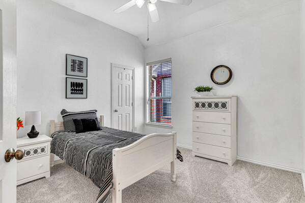 Beautifully appointed four-bedroom, three-and-a-half-bath home in the highly sought-after Homestead at Carrollton community. The thoughtfully designed floor plan offers the primary suite and two secondary bedrooms on the main level, with a generously sized upstairs bedroom featuring an ensuite bathideal as a private guest suite, game room, or media room. The primary suite is a true retreat, complete with a separate shower and jetted soaking tub. Entertain with ease in the formal dining room highlighted by crown molding and chair rail, or work from home in the dedicated study with French doors. The island kitchen opens seamlessly to the spacious family room with a gas-log fireplace, creating a warm and inviting gathering space. The kitchen features granite countertops, abundant cabinetry, a large breakfast bar, and a cozy breakfast nook. Step outside to an oversized patio overlooking a pool-sized backyard, privately enclosed by a multi-level board-on-board fenceperfect for relaxing or entertaining. A small greenbelt directly across from the front porch adds charm and a sense of openness. Located in Lewisville ISD, this home offers comfort, flexibility, and an exceptional setting in one of Carrolltons most desirable neighborhoods.