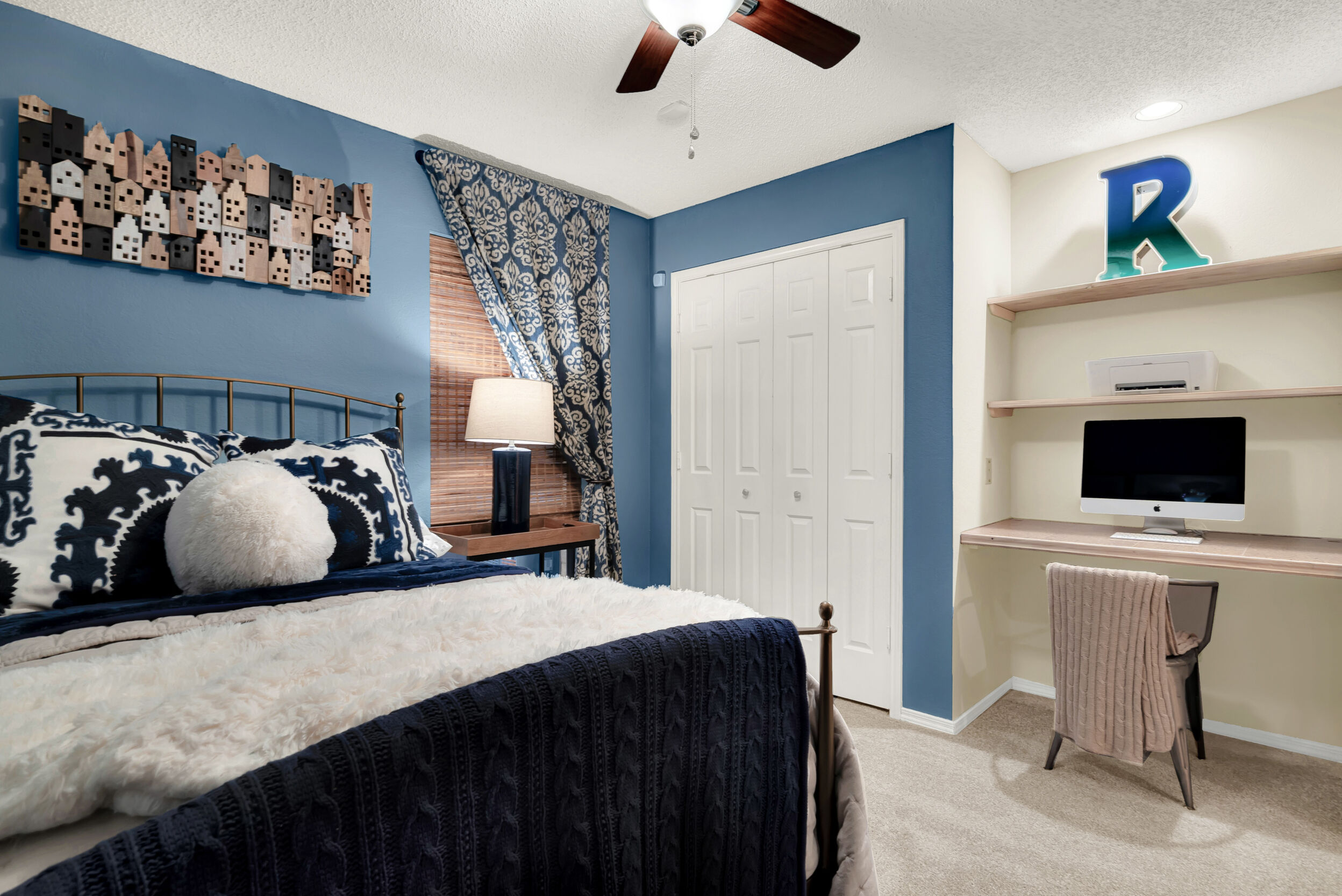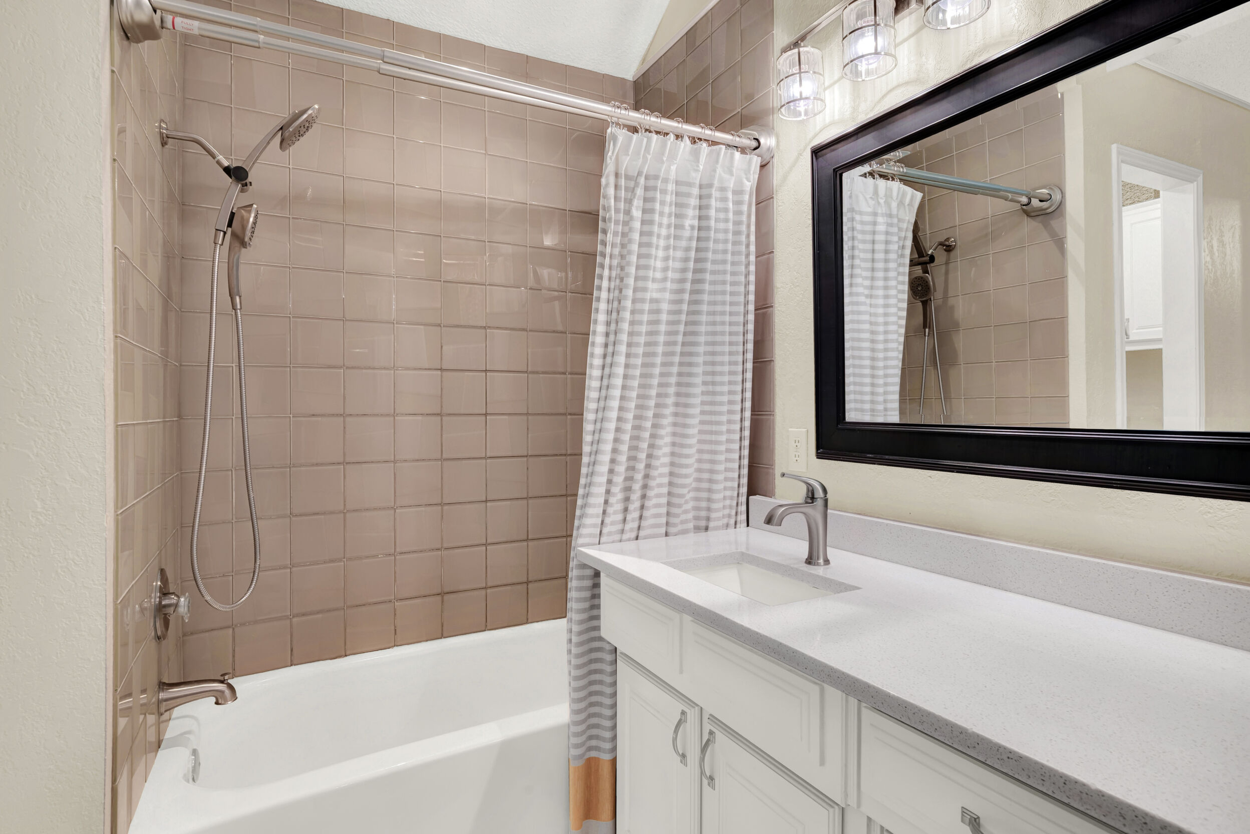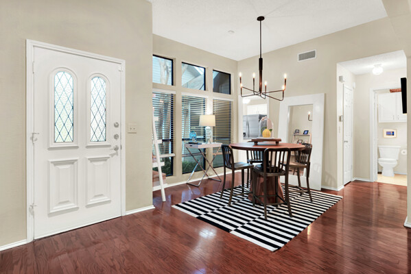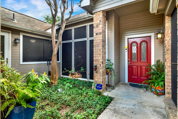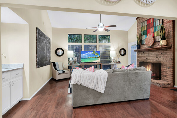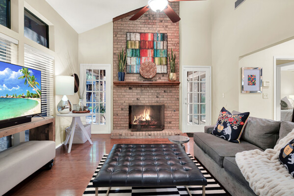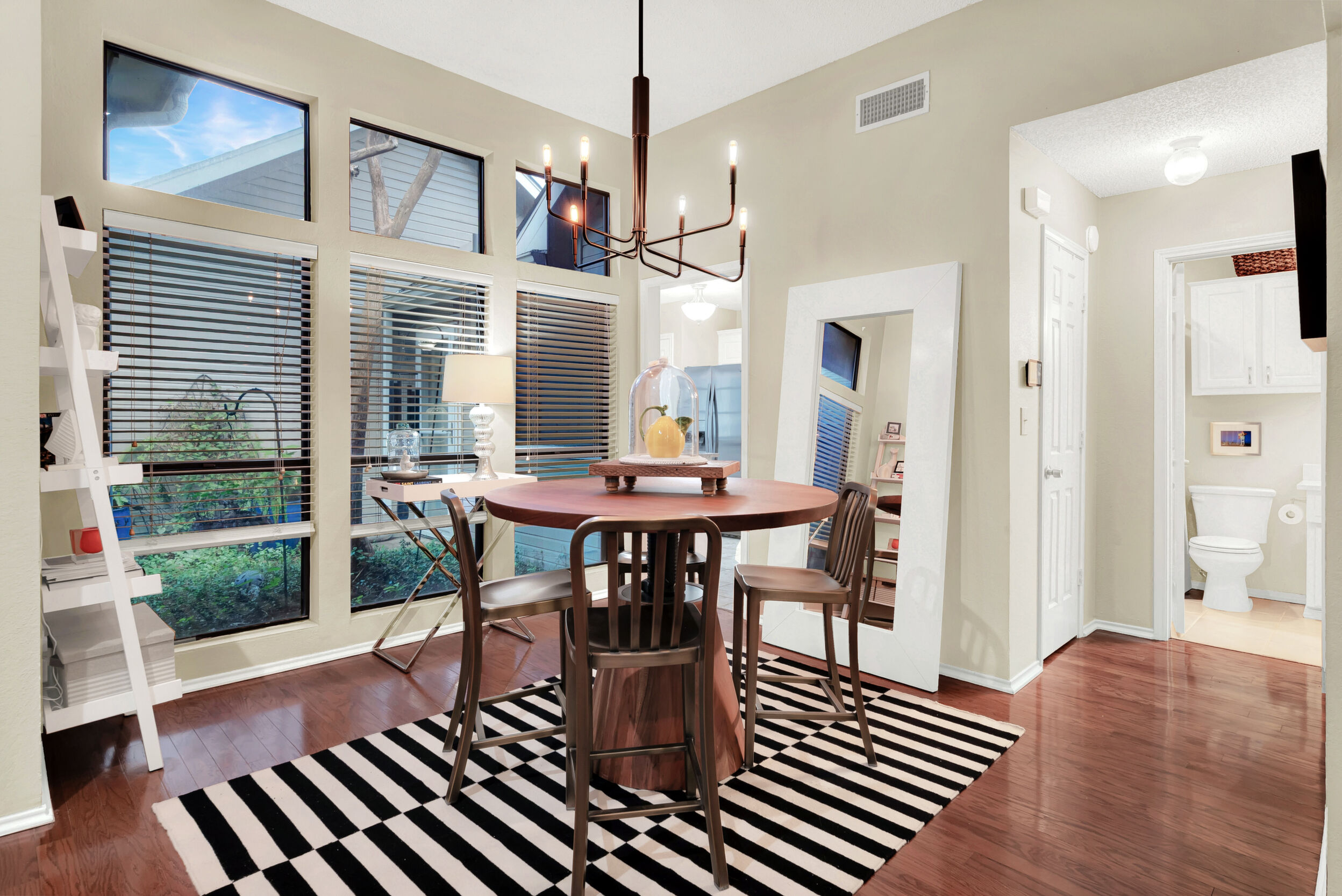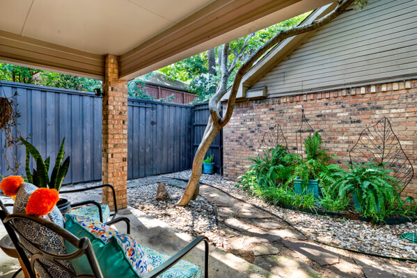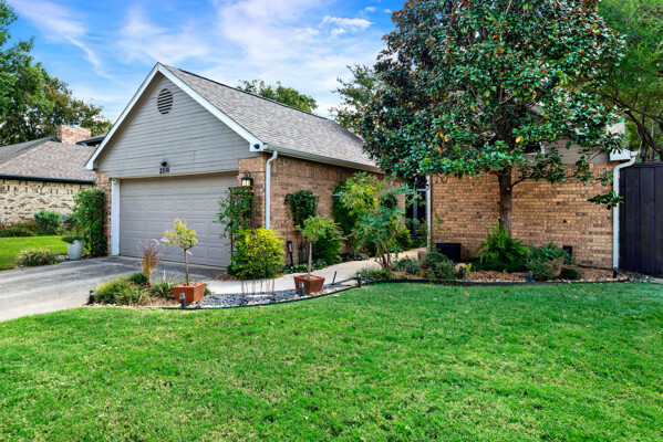 This immaculate 2-bedroom, 2-bathroom home highlights modern design and thoughtful details. The kitchen features stainless steel appliances and a gas stove. In the living and dining area, hardwood floors add warmth, while a vaulted ceiling, gas log fireplace, and a wall of windows create an inviting, light-filled space. The primary bedroom includes a reading nook and French doors that open to a covered patio, extending the living area outdoors. The front yard is attractively landscaped and maintained by the HOA, while the fenced side and rear yards proved additional privacy and outdoor enjoyment with a covered patio. Nearby, the community offers a duck pond with a fountain and a walking trail for relaxation and recreation. Established neighborhood, mature trees, and outstanding location -- quick access to PGBT, DNT & I-35, local shops & dining. Act now!