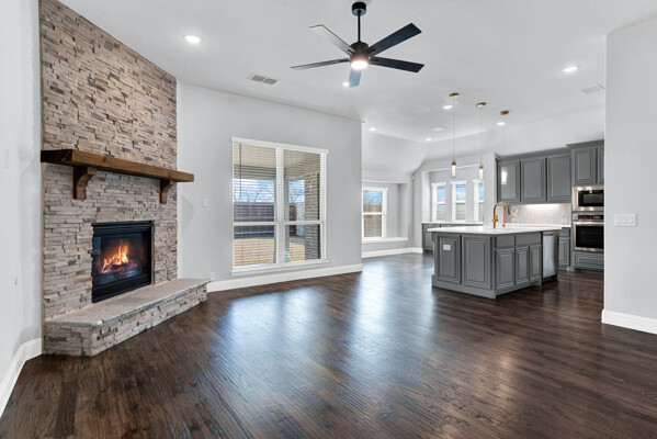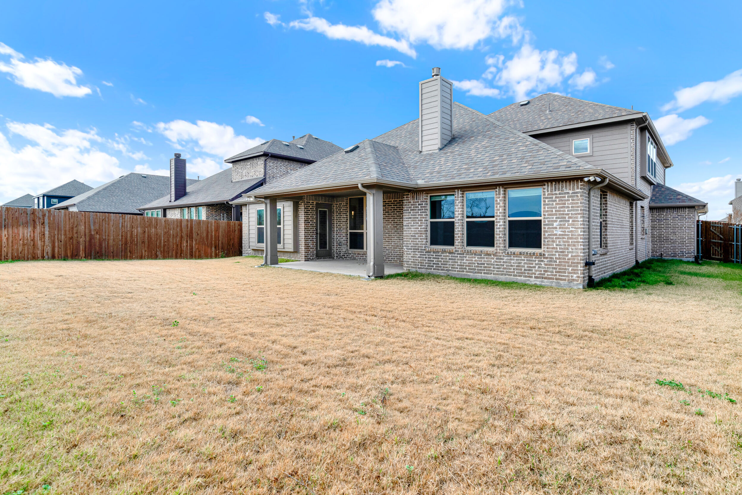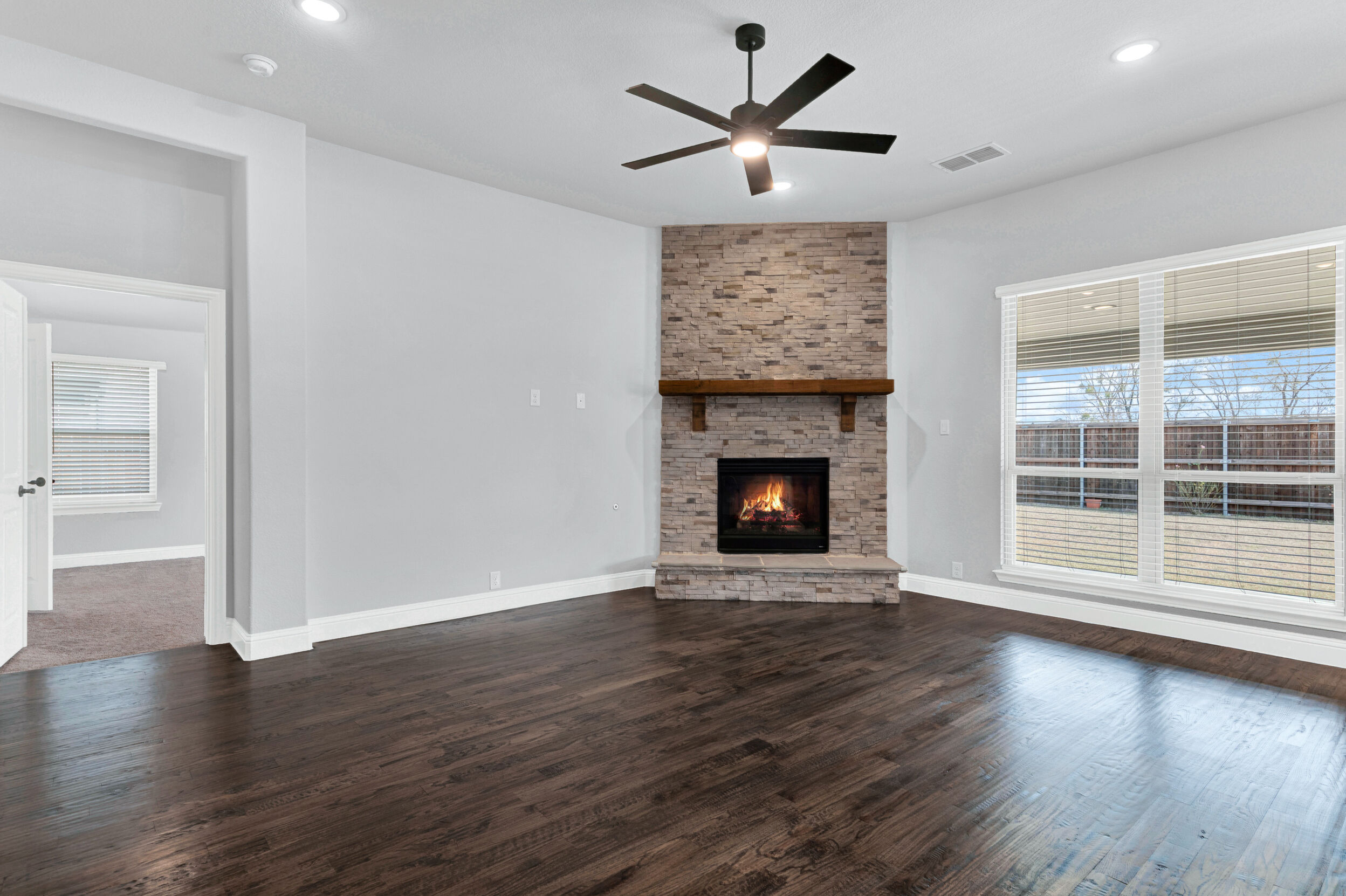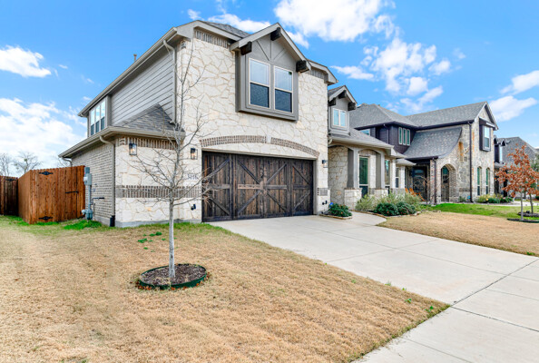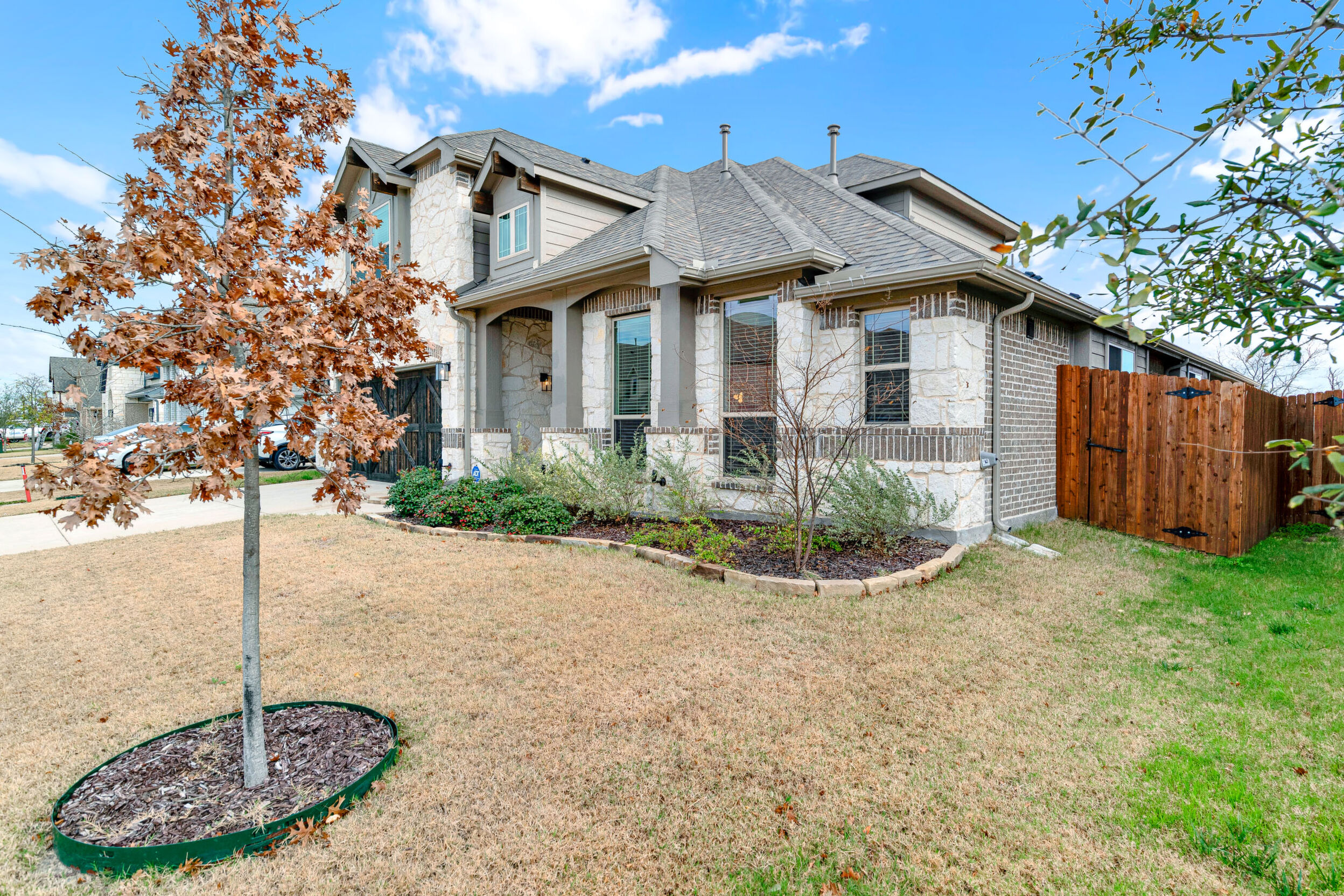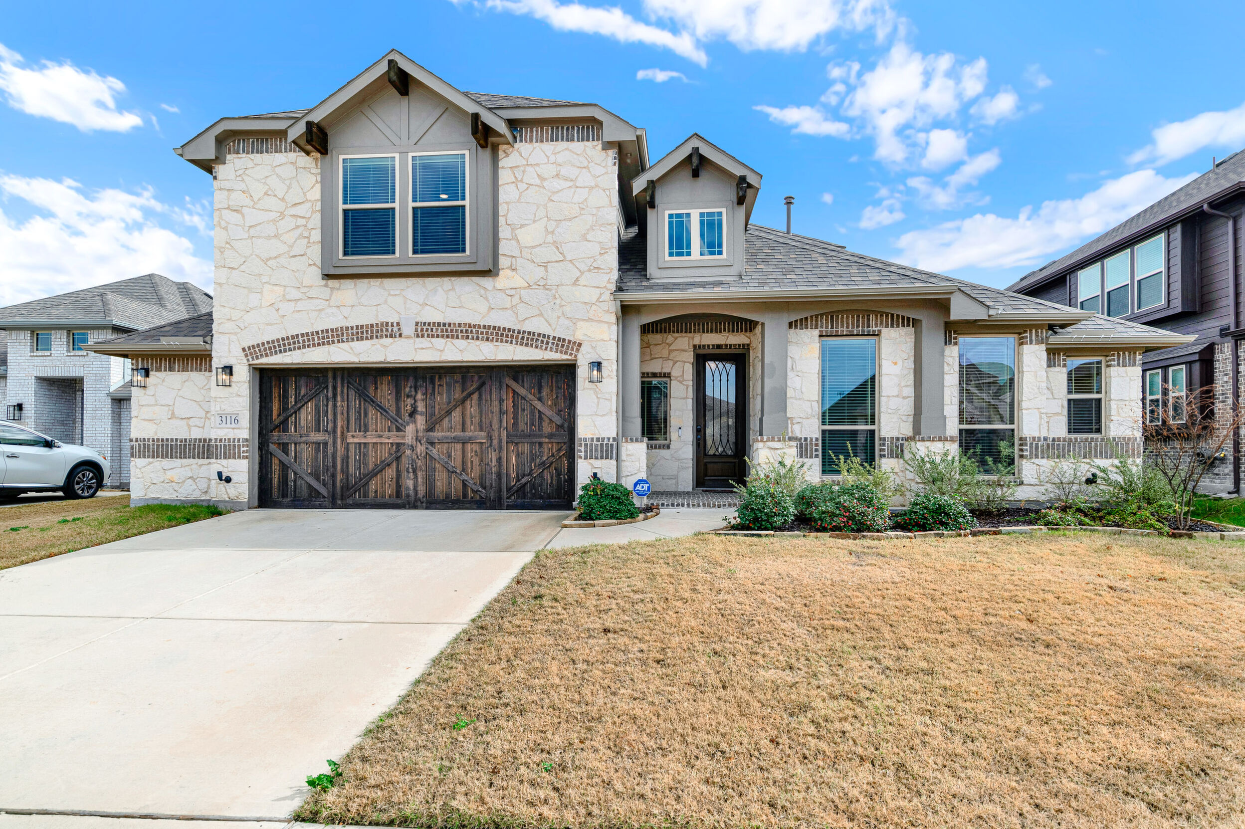 Enjoy the look and feel of a brand-new home without the wait or the new-construction price. Built in 2023 and impeccably maintained, this stunning two-story residence blends modern design, premium finishes, and a highly functional layout ideal for everyday living and entertaining. The architecturally pleasing stone and brick exterior makes a strong first impression, complemented by an 8-foot custom front door and cedar garage door. Inside, site-finished hardwood floors, a stacked stone direct-vent fireplace, and thoughtfully selected upgrades set the tone for a polished yet welcoming interior. Multiple bedrooms on the main level provide flexibility, while dedicated spaces including a private study, formal dining room, game room, and media room ensure room for work, play, and relaxation. The well-appointed kitchen is designed to impress, featuring quartz countertops, a large island workspace, gas cooktop, wood vent hood, pot-and-pan drawers, and a built-in microwave and oven tower that opens to an adjacent breakfast nook. The open floor plan design connects the kitchen to the main living areas, creating a natural flow for gatherings both large and small. Privately situated on the main level, the spacious primary suite offers over 300 square feet of comfort. The luxury ensuite bath includes a drop-in deck-mounted tub, separate shower, granite surfaces, and a generous walk-in closet. An extended covered patio expands the living space outdoors, while the 2-car garage provides ample room for vehicles and seasonal storage. Located in the sought-after Ridge Ranch community, residents enjoy resort-style amenities including pools, parks, trails, and playgrounds. Thoughtful safety features, energy-efficient construction, and move-in-ready condition make this home an exceptional value in a thriving neighborhoodoffering all the benefits of new construction, already perfected.