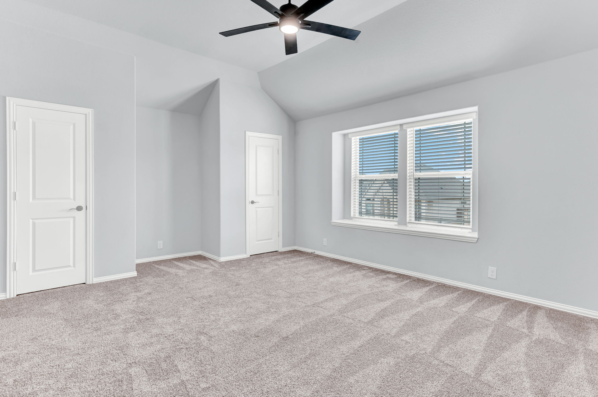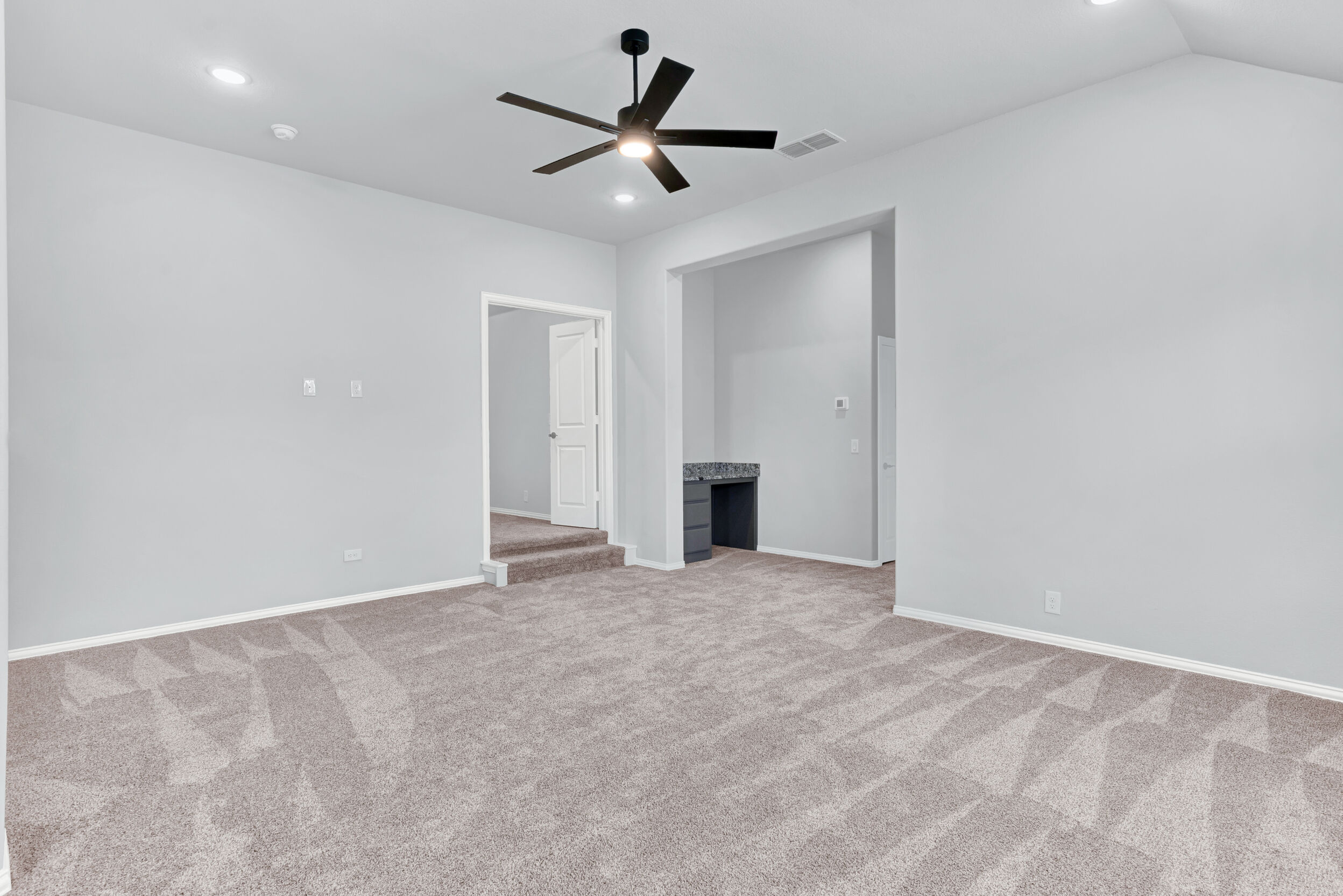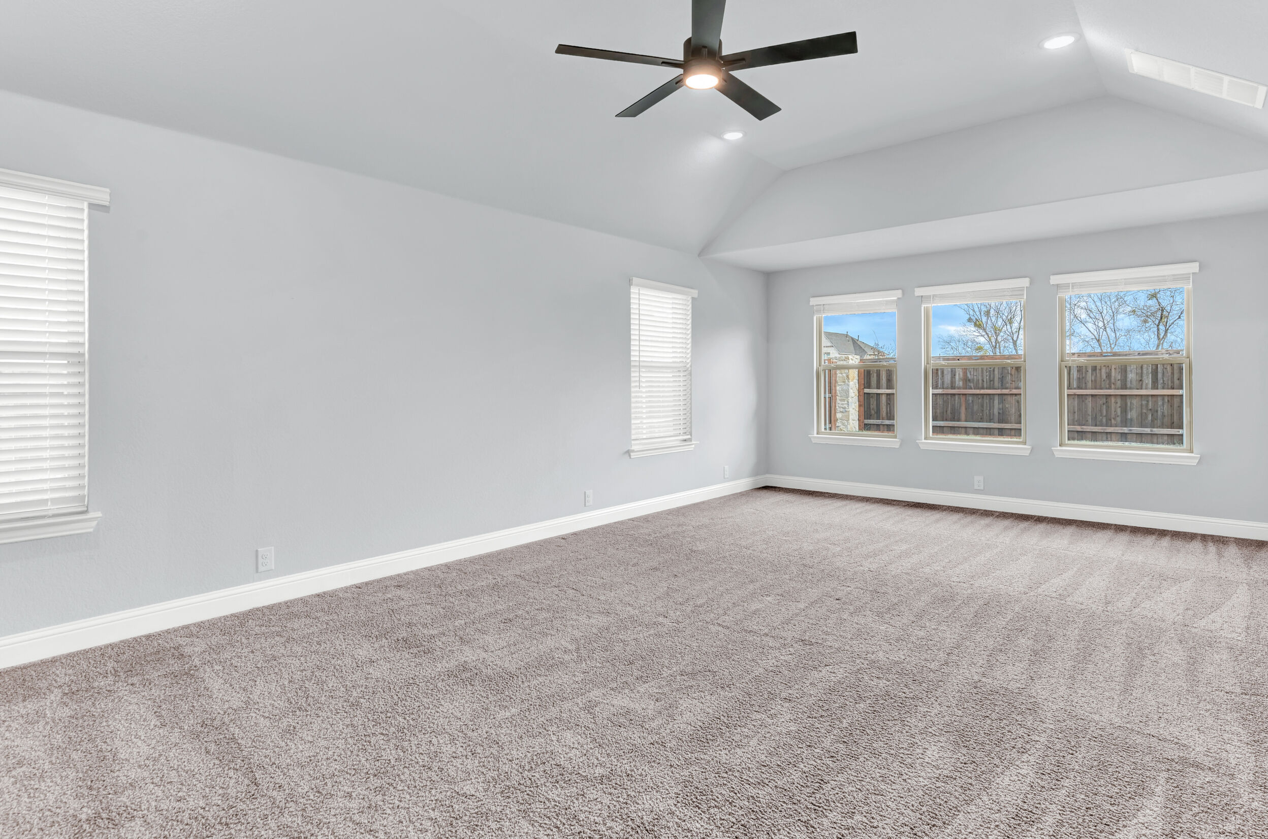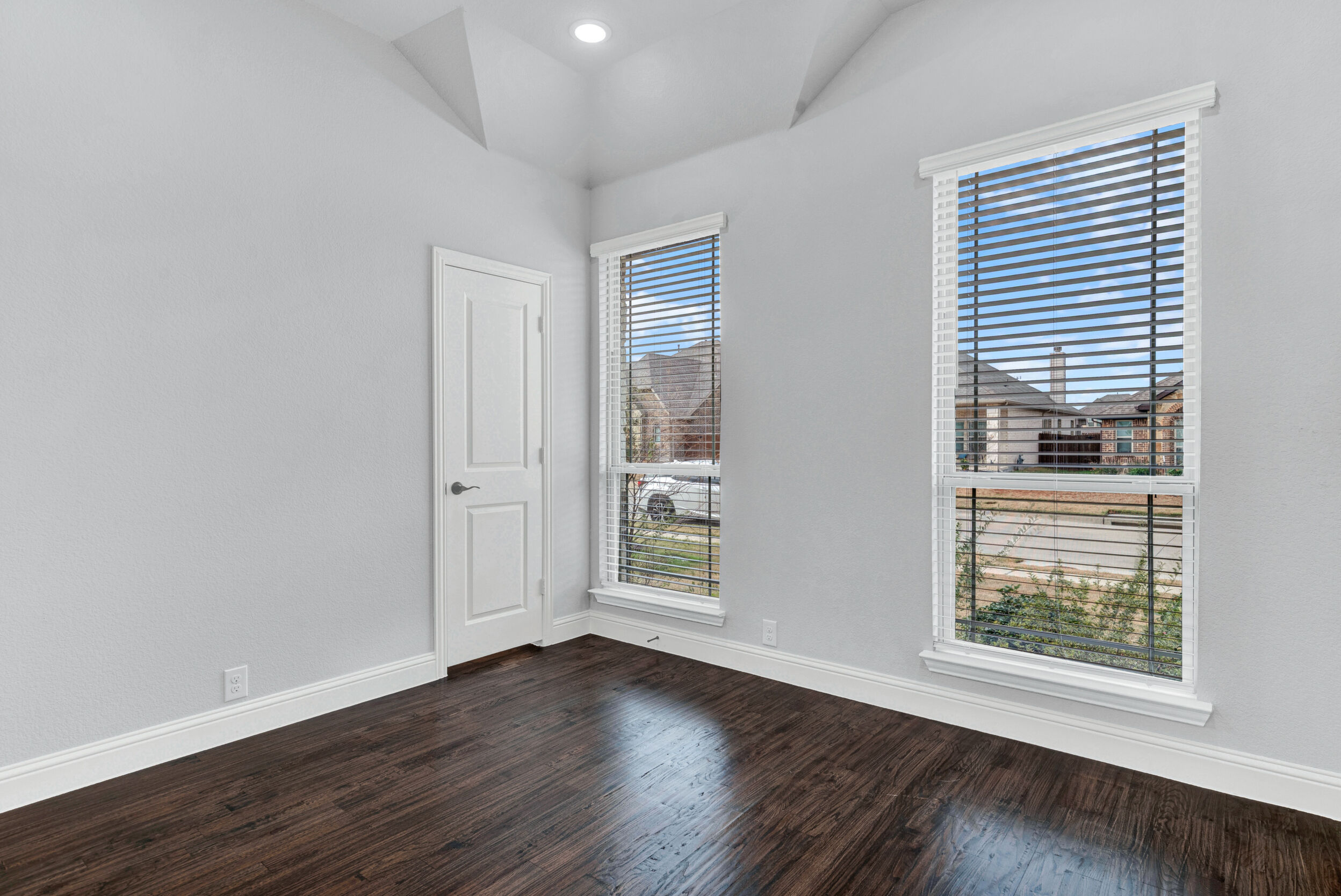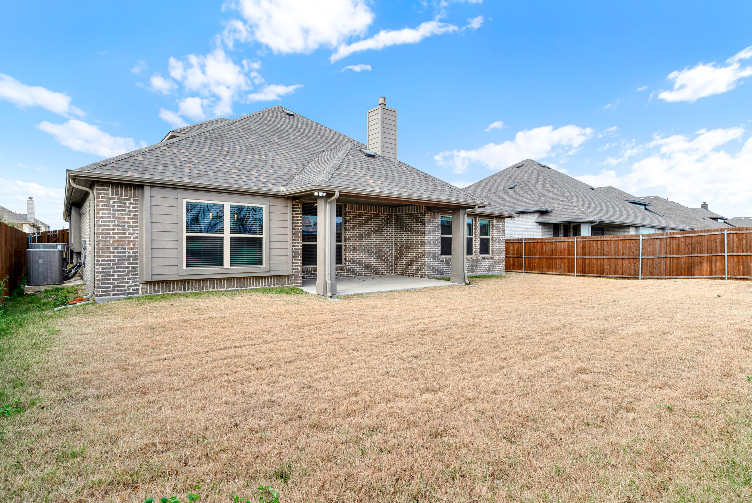 Enjoy the look and feel of a brand-new home without the wait or the new-construction price. Built in 2023 and impeccably maintained, this stunning two-story residence blends modern design, premium finishes, and a highly functional layout ideal for everyday living and entertaining. The architecturally pleasing stone and brick exterior makes a strong first impression, complemented by an 8-foot custom front door and cedar garage door. Inside, site-finished hardwood floors, a stacked stone direct-vent fireplace, and thoughtfully selected upgrades set the tone for a polished yet welcoming interior. Multiple bedrooms on the main level provide flexibility, while dedicated spaces including a private study, formal dining room, game room, and media room ensure room for work, play, and relaxation. The well-appointed kitchen is designed to impress, featuring quartz countertops, a large island workspace, gas cooktop, wood vent hood, pot-and-pan drawers, and a built-in microwave and oven tower that opens to an adjacent breakfast nook. The open floor plan design connects the kitchen to the main living areas, creating a natural flow for gatherings both large and small. Privately situated on the main level, the spacious primary suite offers over 300 square feet of comfort. The luxury ensuite bath includes a drop-in deck-mounted tub, separate shower, granite surfaces, and a generous walk-in closet. An extended covered patio expands the living space outdoors, while the 2-car garage provides ample room for vehicles and seasonal storage. Located in the sought-after Ridge Ranch community, residents enjoy resort-style amenities including pools, parks, trails, and playgrounds. Thoughtful safety features, energy-efficient construction, and move-in-ready condition make this home an exceptional value in a thriving neighborhoodoffering all the benefits of new construction, already perfected.
