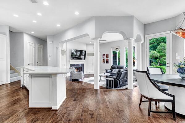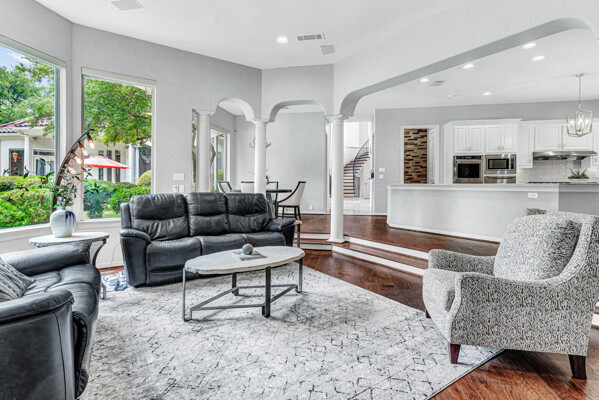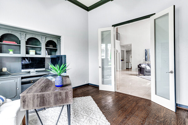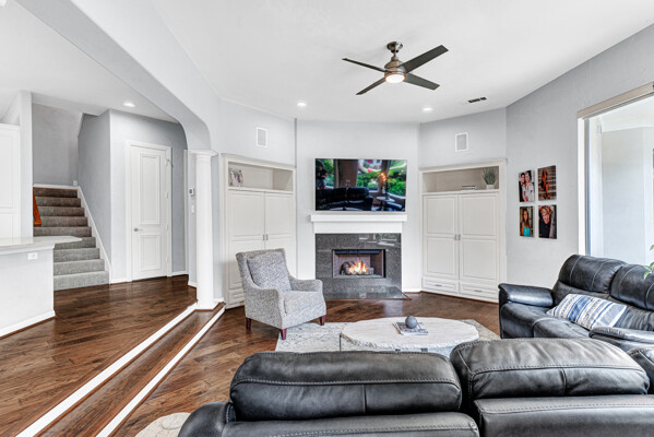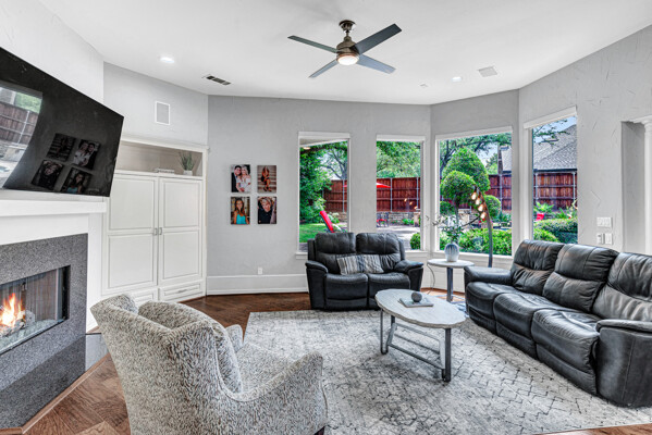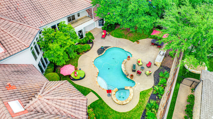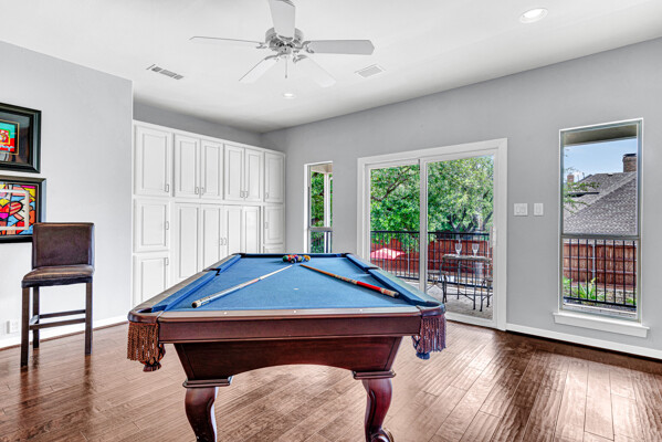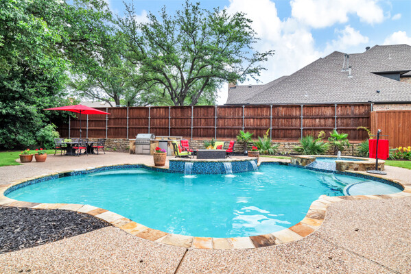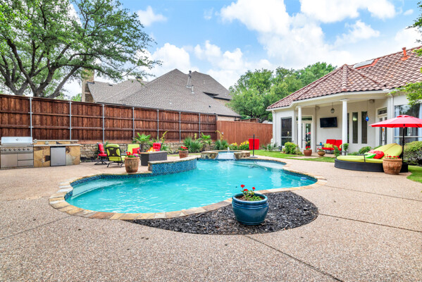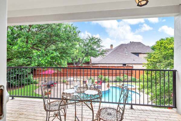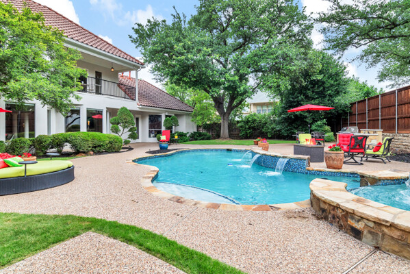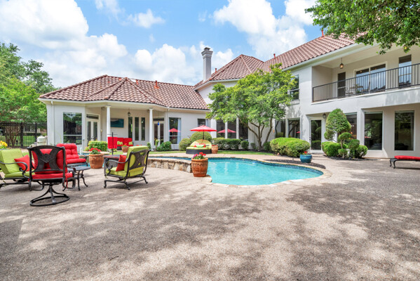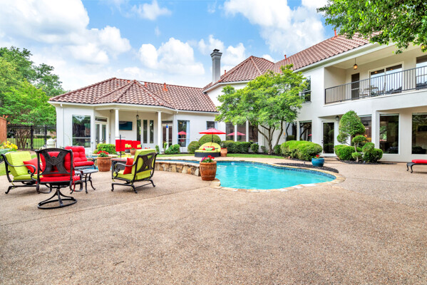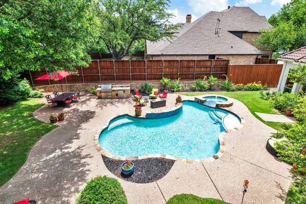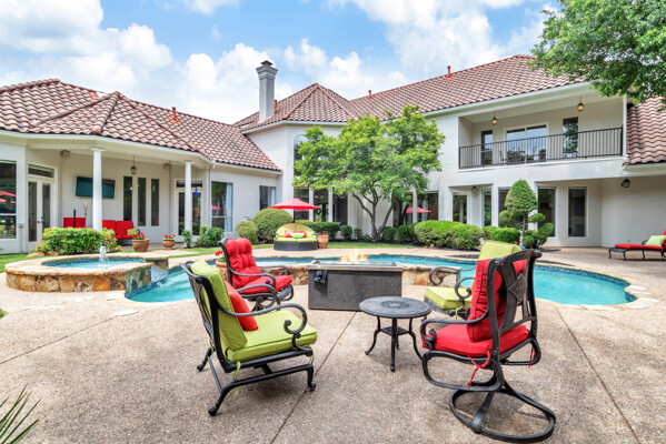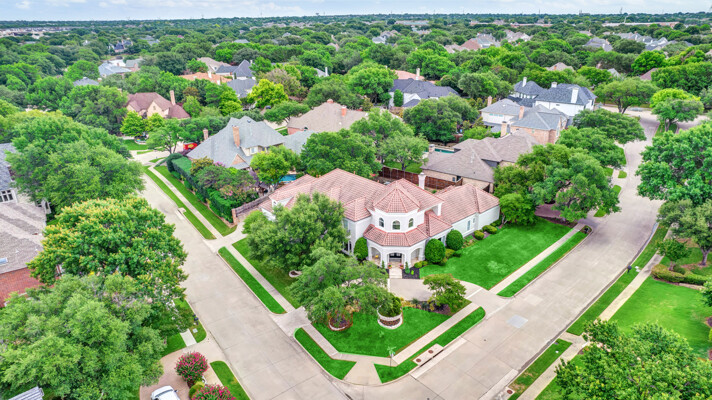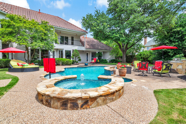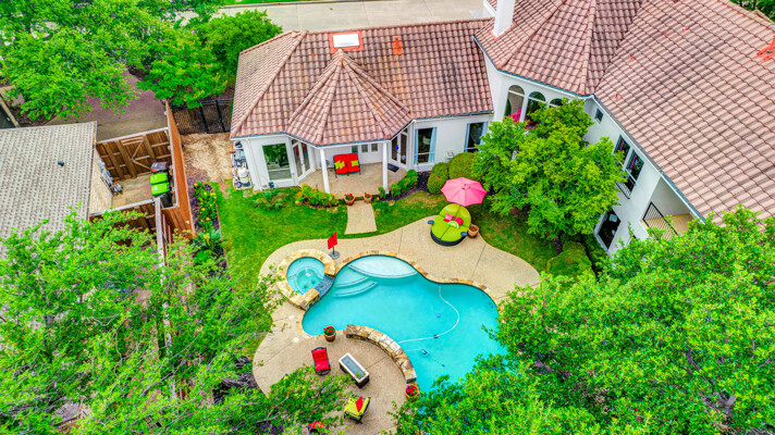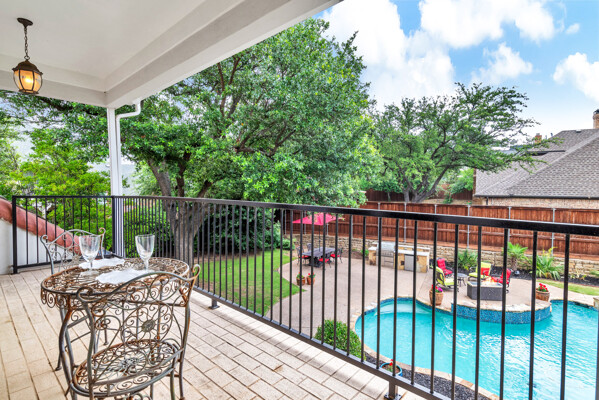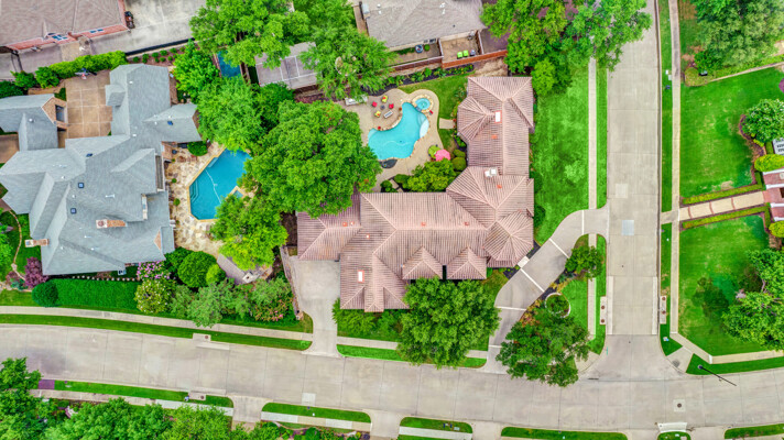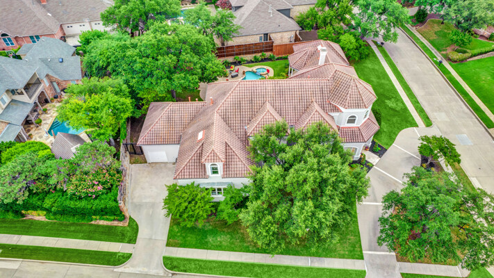This custom-built home is set on a large lot, complete with a pool, spa, and a yard shaded by grand trees. The roomy kitchen boasts KitchenAid appliances including gas cooktop, double ovens and warming drawer. It also offers a spacious walk-in pantry, ample cabinet and counter space, and overlooks the backyard. It flows into the family room also with pool views and built-ins. The primary suite is a retreat with its warm fireplace and luxurious bath. Next to the bath, a flexible exercise room can also be a nursery, extra closet, or a second office. The separate study welcomes you with beautiful woodwork at its entrance sunny windows and built-in cabinetry and opens to an impressive formal living room with tall ceilings. Upstairs, youll find three more bedrooms, each with its own ensuite bath, and a media room. The game room, featuring elegant hardwood floors, opens to a balcony that looks out over the expansive, beautifully landscaped backyard and pool. Recent updates as of June 2025 includes hardwood flooring throughout most of the downstairs, freshly painted office, primary bedroom and bath, enhanced kitchen lighting, quartzite countertops, and modernized hardware in both the kitchen and primary bath! Tucked away in the sought-after Lakeside on Preston, this gorgeous neighborhood is a paradise of natural beauty and fun, with peaceful lakes, lush parks, scenic walking paths, and a variety of sports facilities like a pool, tennis courts, pickleball, and basketball. Youll love the ease of walking to the nearby Starbucks, delightful shops, and a range of dining spots!