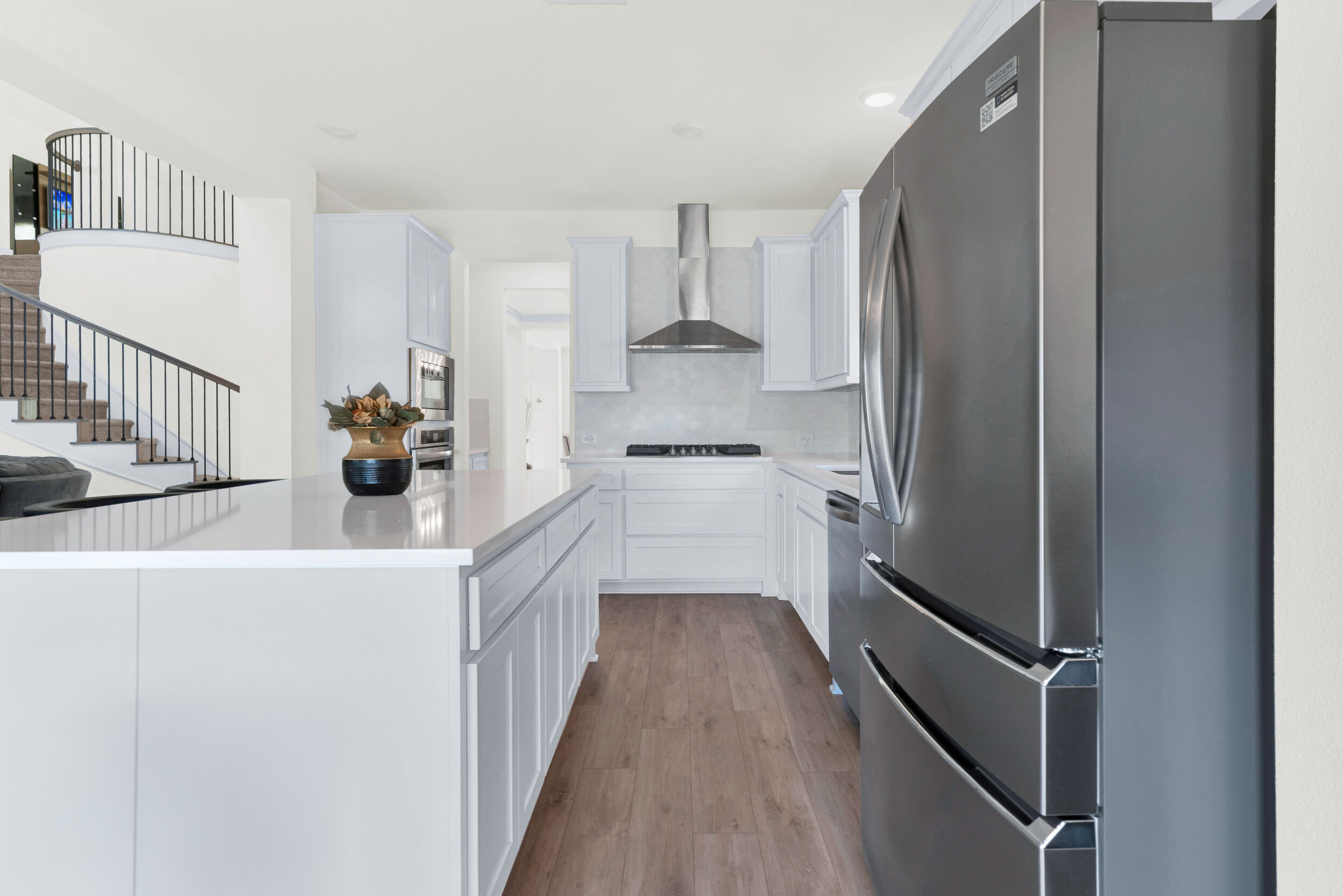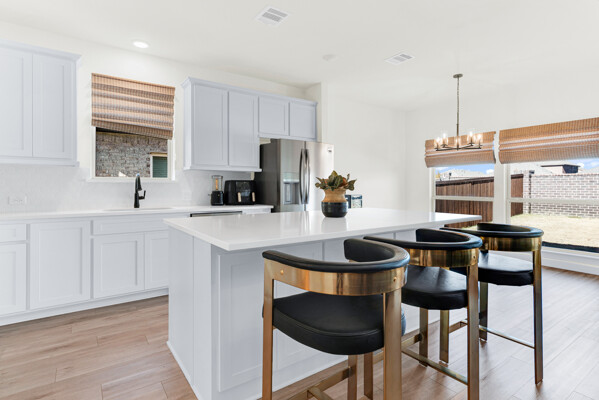 Stunning First Texas Home in Celina, Texas, zoned for Prosper ISD! July 2024 build! Gorgeous curb appeal, upgraded front door, leading to soaring ceilings, spiral staircase and luxurious living suitable for family and friends. The home boasts 5 bedrooms, 3.5 bathrooms, 3 living areas, 2 dining areas, office space, gorgeous kitchen, and spacious outdoor living. The kitchen features a large island, built-in cooktop, stacked microwave and oven, full vent hood, quartz countertops, pot and pan drawers, soft close doors and drawers 42 inch cabinets and offers a seamless flow into the living area. Fridge and microwave will stay with the home! The adjacent living room is bathed in natural light by a stunning wall of windows, featuring a striking accent wall with electric fireplace, creating a cozy focal point. The luxurious primary suite is situated on the 2nd level and provides enormous his-and-hers walk-in closets, framed mirrors, tiled bath walls and a stand alone tub. The family will have plenty of space to live and play with a game room featuring open railing, office space with French doors, and generously sized bedrooms with easy access to bathrooms. Outside, the covered back patio extends your living space year-round, overlooking a spacious yard perfect for play, gardening, or simply relaxing. Upgrades include extended garage, two walk-in closets in primary bedroom, Refrigerator and microwave will remain with the home; washer and dryer negotiable. This home truly has it all: space for the whole family, high end finishes, and timeless style. Welcome home!